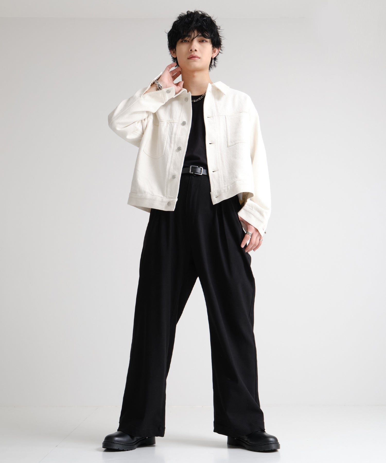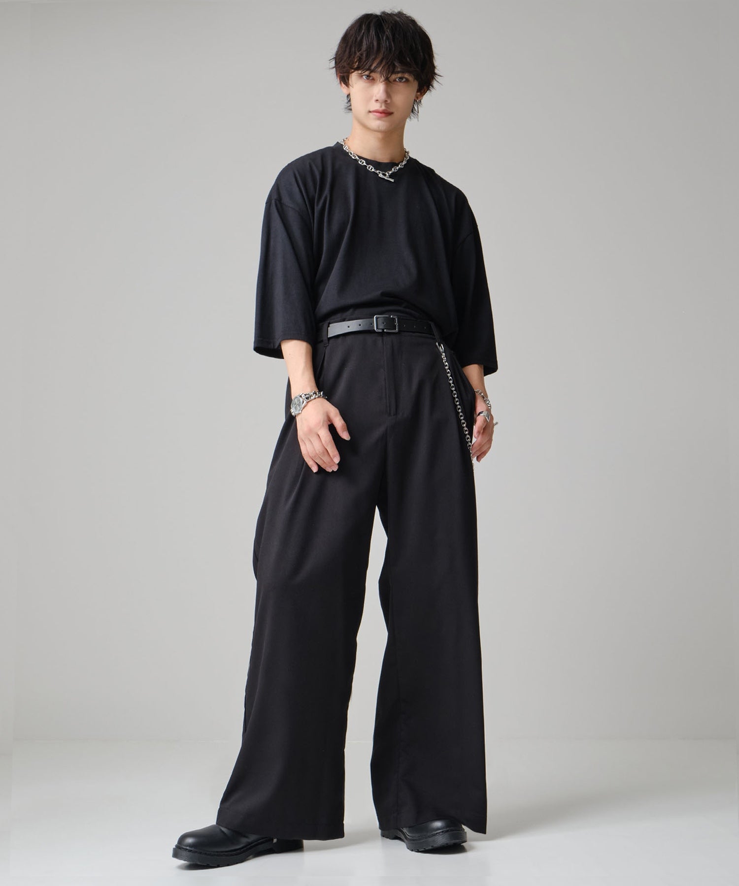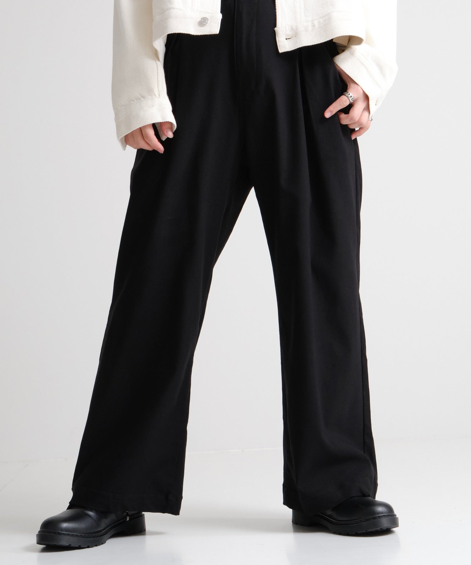 ゆとりあるワイドシルエットに、脚元はすっきりテーパード。